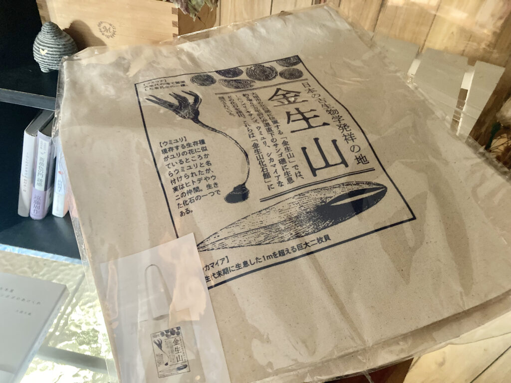 ふるさと納税返礼品として公開されたばかりの「金生山で見つかる貴重な化石」をモチーフにしたカバンも置かれていました。